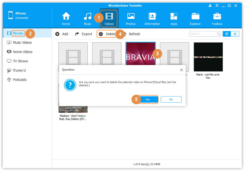 Nota: Con TunesGO potrai cancellare qualsiasi tipo di file video presente sul tuo cellulare o tablet. Prima della rimozione dei dati il programma ti chieder? sempre la conferma