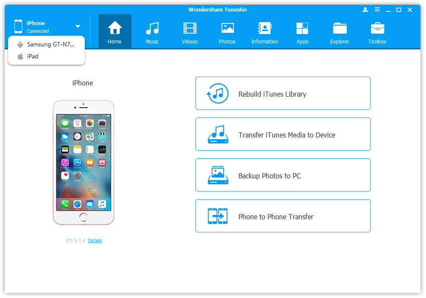 Innanzitutto scarica ed installa TunesGO sul tuo PC. Poi avvia il programma e leggi le indicazioni sottostanti per trasferire contatti tra iPhone e Android (Samsung, Huawei, Honor, LG, Sony, Motorola, OnePlus, Nexus, ecc...)