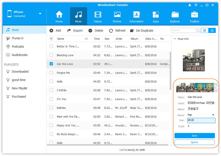 Cosa aspetti? Metti ordine alle canzoni salvate sul tuo smartphone o tablet e aggiornale con le informazioni corrette o mancanti. TunesGO supporta iPhone, iPad, iPod e tutti i dispositivi Android come Samsung Galaxy, HTC, LG, Huawei, Honor, OnePlus, Motorola, Sony, Google, ecc.......